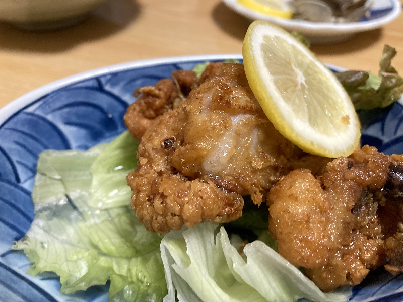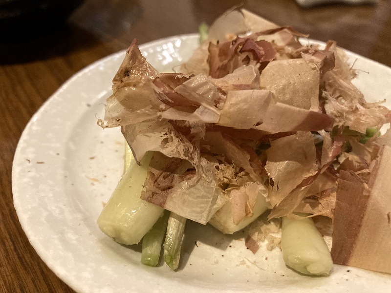 一階がカウンター、二階がお座敷なのでめっちゃ急な階段を上ってお座敷へ。4人用にメニューもできているんでしょうけど1品ずつ頼んで5人でシェアするとちょうどよかったです。お通しも「鮮魚のピリ辛?」と言ってたと思いますがおいしいです。