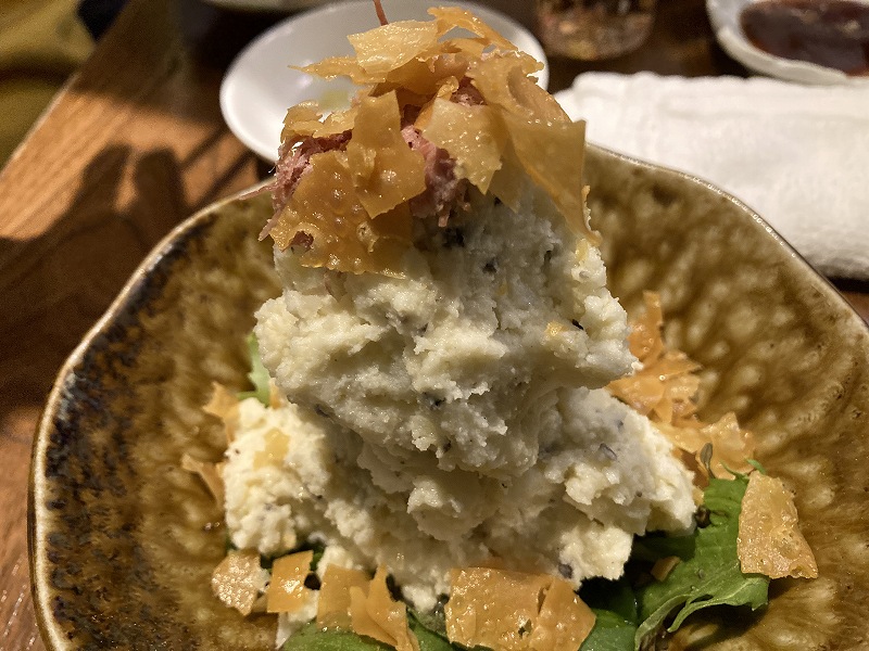 前回と変わったメニューをということでヒラヤーチと黒糖そら豆と島らっきょうと茗荷のおかかあえを注文しました。ヒラヤーチはタコ焼き味のお好み焼き?甘いコーティングのそら豆?茗荷の和え物?なんだか初めてのメニュ^-でしたが、どれもめっちゃおいしかったです!(ちょっと雑くてすみません)