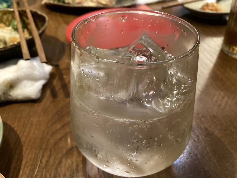 しむらのポテサラで塩分をリセット!お酒も各々の好きなものにして楽しみます。僕は日本のジン(まさひろクラフトジン)のソーダ割にしました。久しぶりにジンを飲みましたがやっぱりおいしいですね!