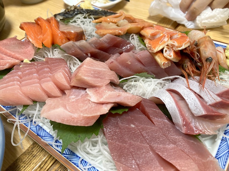 刺身盛り合わせ(4人前の厚い刺身がみんなおいしいです。豪華ー)