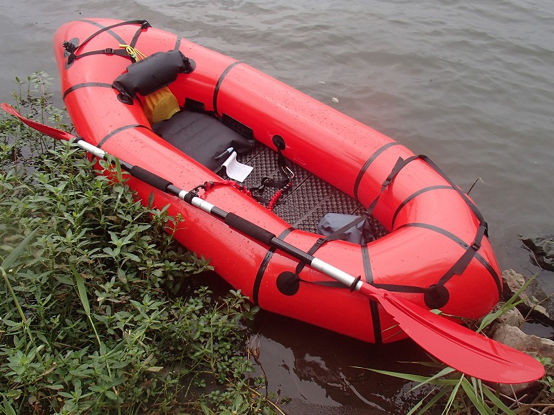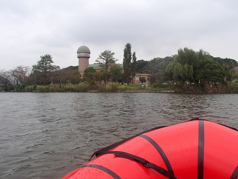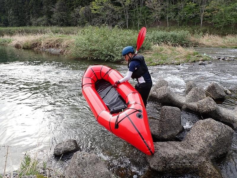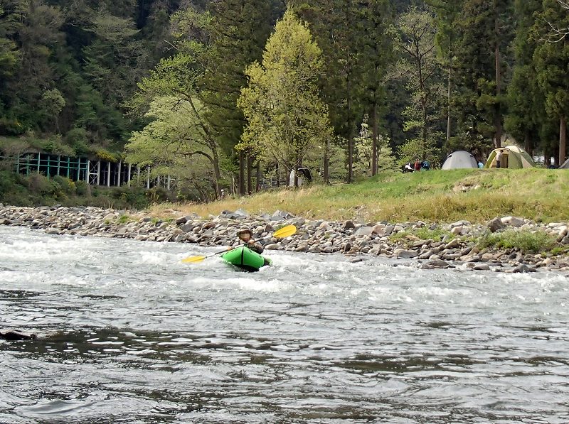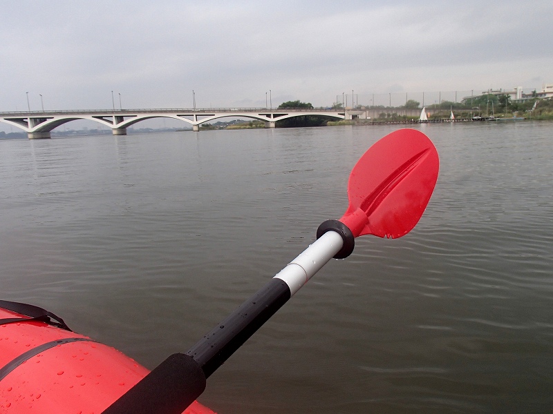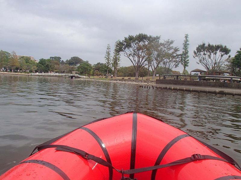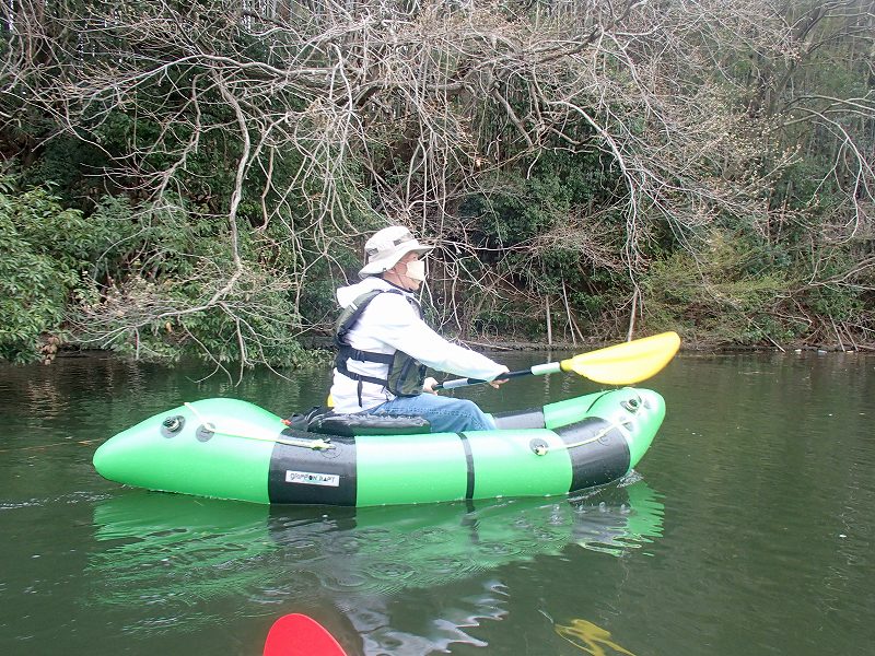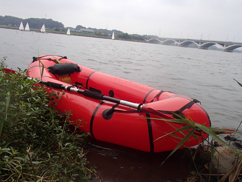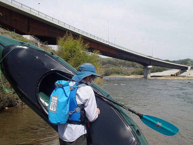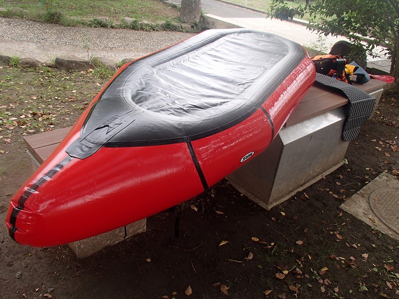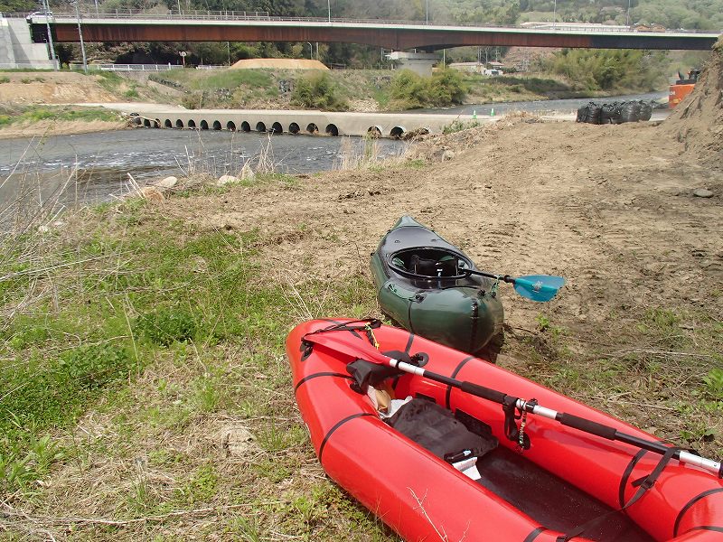 これまで1人ではカヤック乗らないようにしてましたが、もう一人で上下船できるようになりましたし、激しいところでなければ大丈夫でしょう〜。という事で水の館の駐車場でパックラフトを膨らませて河童の横から出艇します。ここはウォータースポーツする人用に入口を作ってくれていて、少し砂浜のようにもなっているので安心です。