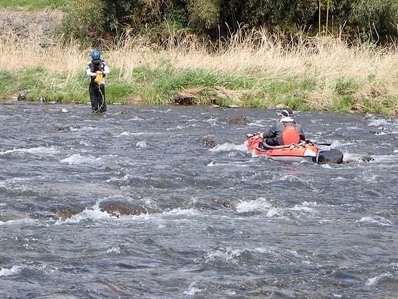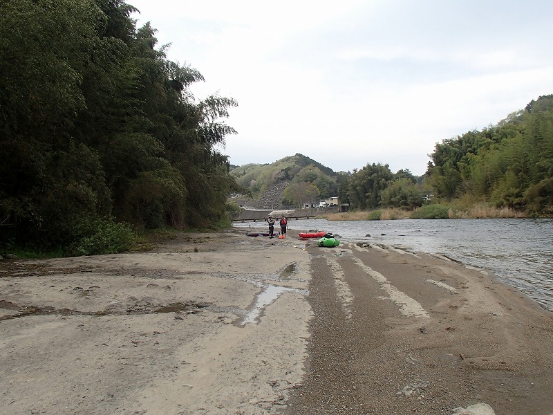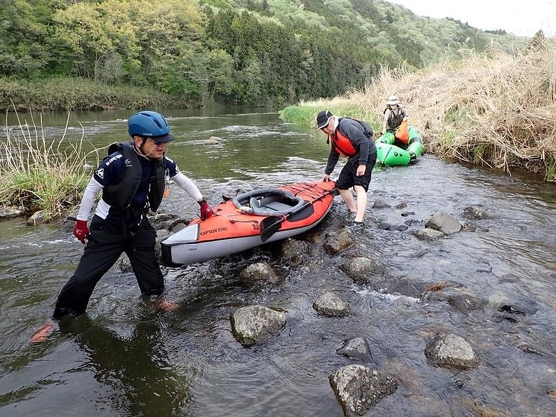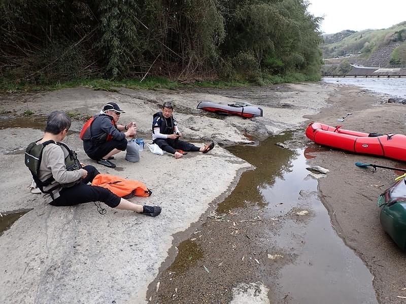 1級以上の瀬がある場合はいったん上陸して川の流れを確認しにいきます。(スカウティングって言う)水が少ないので座礁しないためでもあるので、あの橋の下は右、その先はいったん左にいってすぐに右とか考えないといけません。プカプカ浮いてるだけじゃないんですよ〜