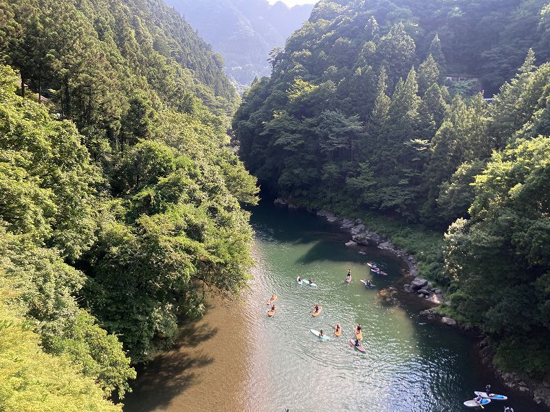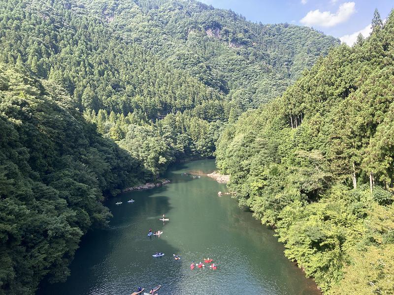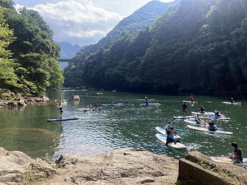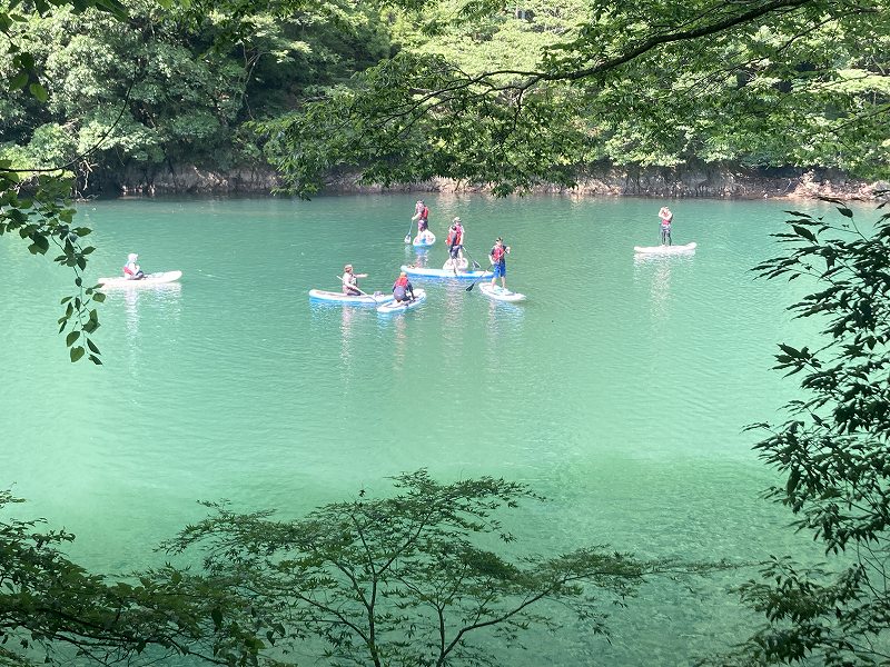 気になるハンバーグのお店があって駐車場は有料が2つ(20台くらいかな?)、無料が1つ(4台だけ)あるので朝早く到着すればいっぱいになることはないんでしょうね。ま、荷物降ろして車だけ遠くに停める作戦もありです。今回は白丸ダムの駐車場に駐車しているので国道を歩きましたが15分くらいですので歩けない距離ではないですが、出廷場所まで10分くらいかかります。白丸駅から徒歩5分くらいのようなので電車アプローチも可能です。体験ツアーが始まるのは10時くらいだと思うので8時前に出艇すると静かに楽しめそうな気がしますね。どこかで遭遇しますけどあれだけのSUPと同時に出艇したらカヤックは進めないですね。