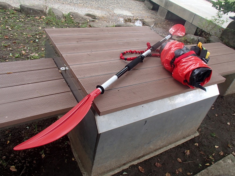 僕がカヤックするときに使ってるPFD(パーソナルフローティングデバイス)は釣り用の安い中華製のものです。ま、目立つようにオレンジ迷彩に惹かれたんですけどね。カヤックする場合は背もたれ付きの椅子のようなところに座るので、背中の部分のウレタンがないのですが、釣り用なのでがっつりあります。これが邪魔なので半分に折ってあります。通常はカヤックするために車で移動するのですが、多摩地区からの場合は電車で移動も想定してパドルを4分割タイプにしてありました。PFDは来ていればいいかな?と思ってたけど、電車の中ではデカいしオレンジ迷彩だし目立つよな〜(笑)