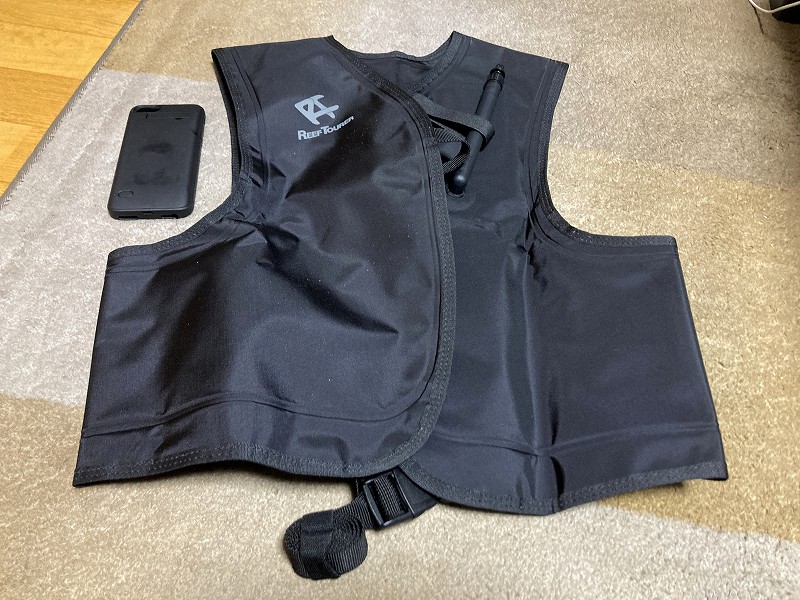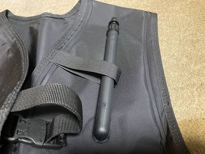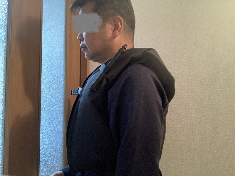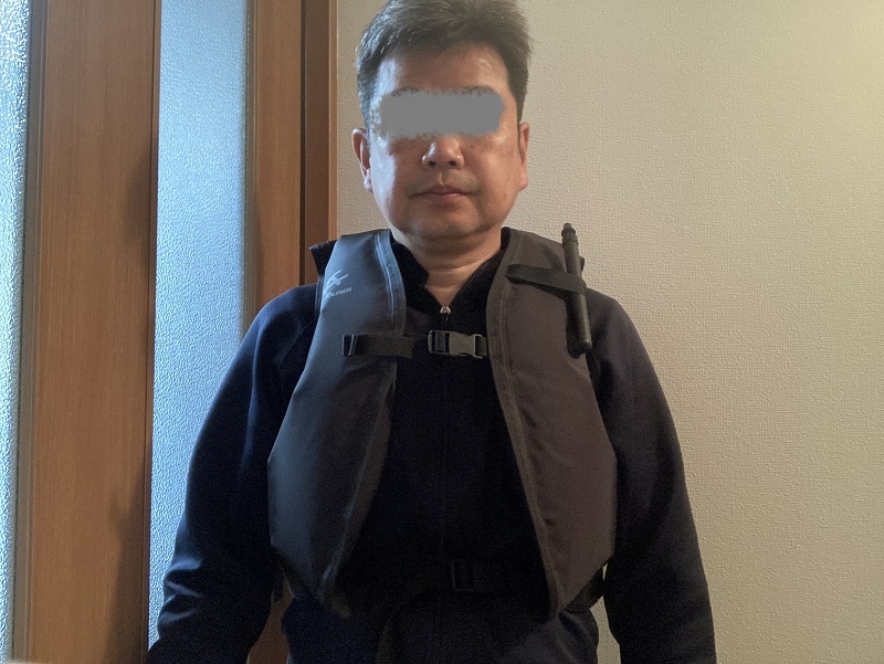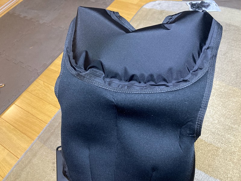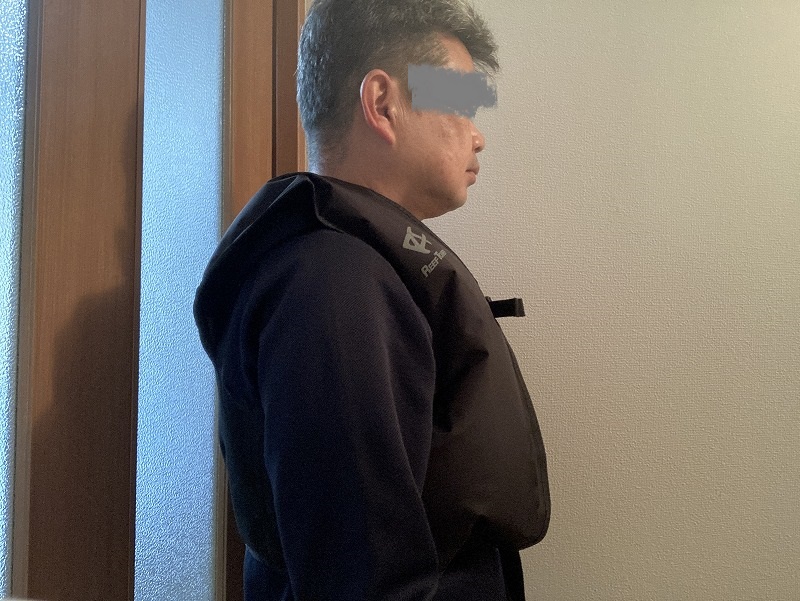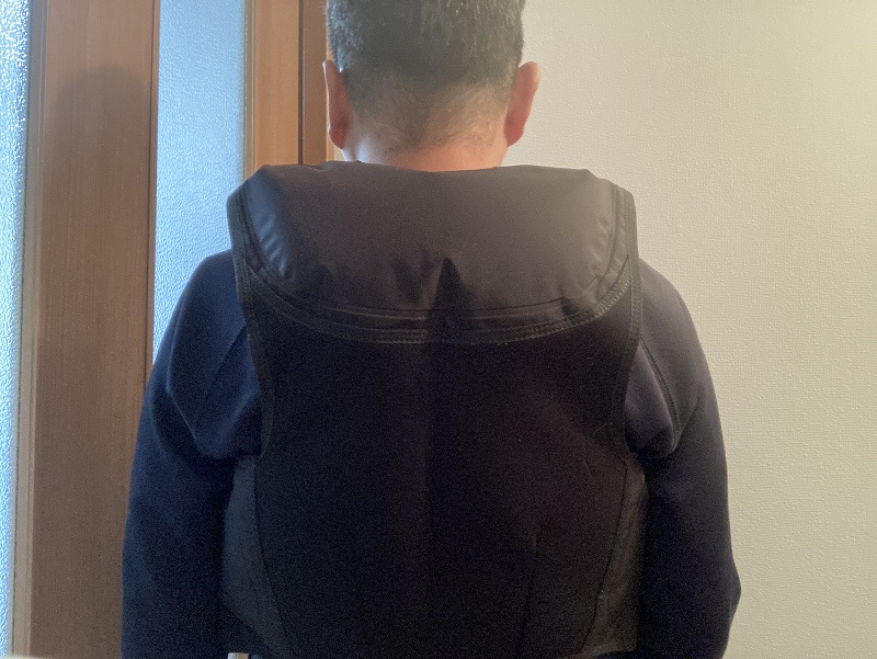 ちょっと着てみましたが、空気があまり入ってない状態でこんな感じです。もう少し空気を入れて使いましょうかね。入れすぎると苦しいです(笑)口コミでも入れすぎないほうがいいとのことでした。