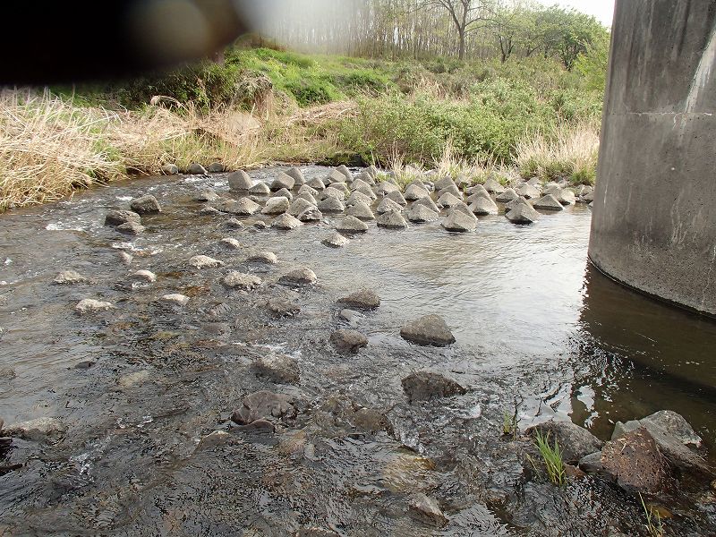 陸橋の下を歩いて通過する場面もありました。(ポーテージって言います)どこまで行けるかを様子を見てましたがギリギリまで近づいてからカヤックを担いで通過します。こんなにデコボコなので歩くのも大変です。まっちさんの艇は重いので2人で担ぎます。