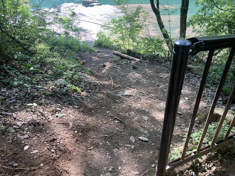 出艇場所はチェックできたので、駐車場からのアプローチをチェックするために歩いてみましたが5分くらい歩けばいいようです。ただし、登山道で階段なので担いで歩かないといけないので、パックラフトじゃないと辛いかもしれないですね。(フォールディングカヤックの人も出艇されているようでしたけど)