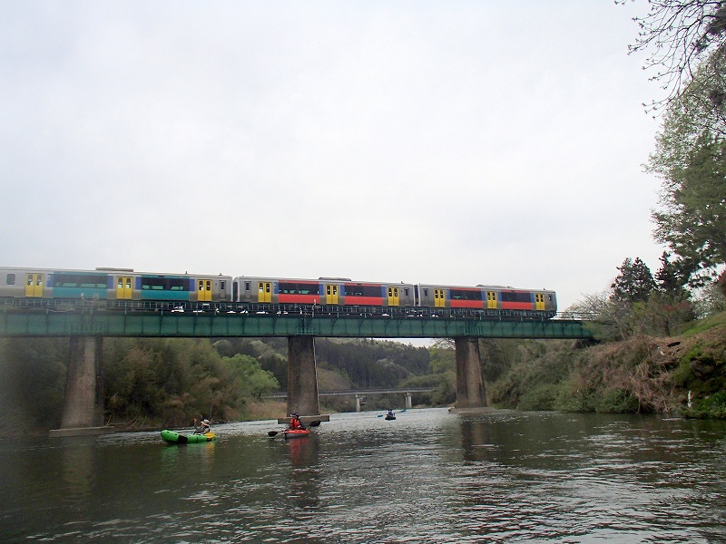いつもカヌーマップとカヌーツーリングの情報を参考にさせてもらってます。今回は特にカヌーツーリングにある「1級の瀬があるよ。初心者は右側ポーテージできます」等の情報にすくわれました。久慈川はクネクネしているので幹線道路やJR水郡線の陸橋を何度も通過するので、水郡線のカラフルな車両が通過したタイミングでいい写真が撮れました!