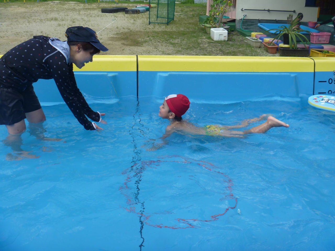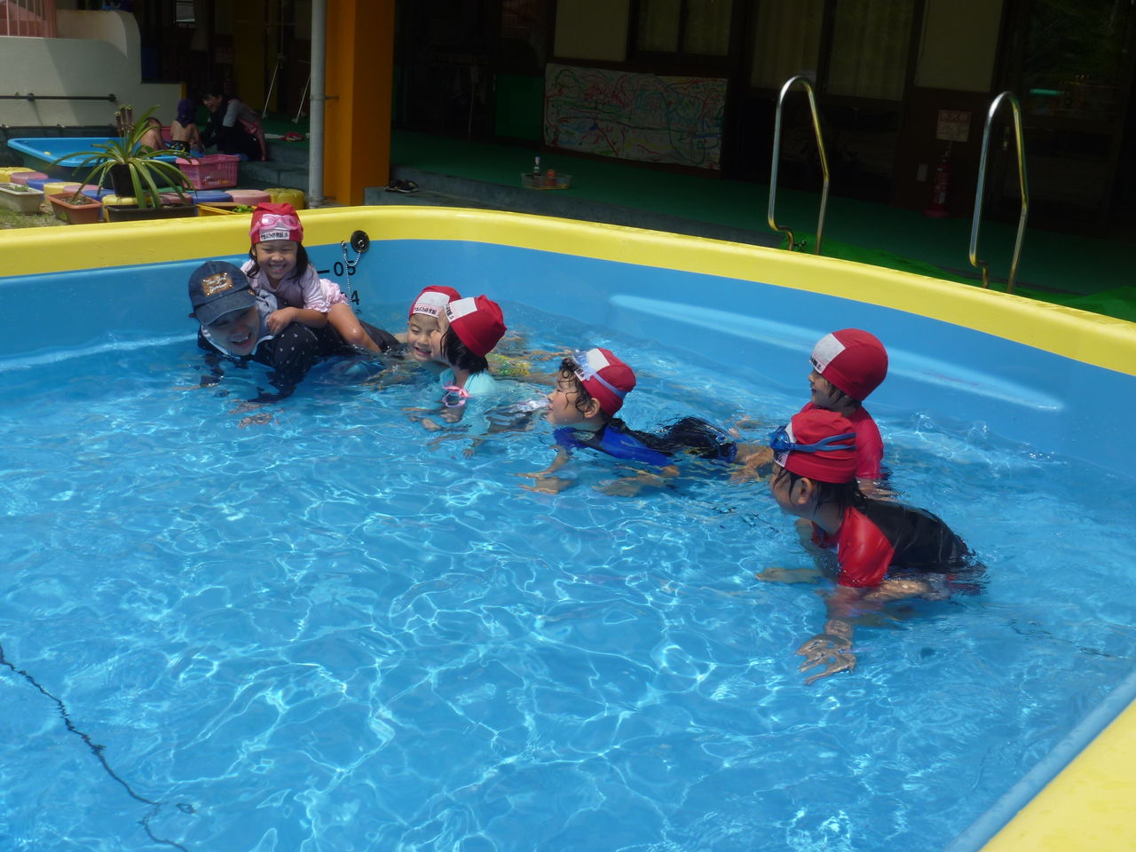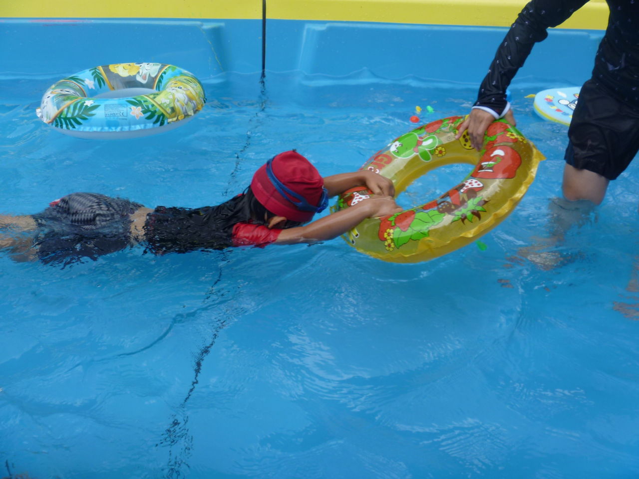 楽しく遊びながら水に親しみます。子どもたち一人ひとりめあてをもって、遊びながらしぜんと水に慣れていけるようにしています。