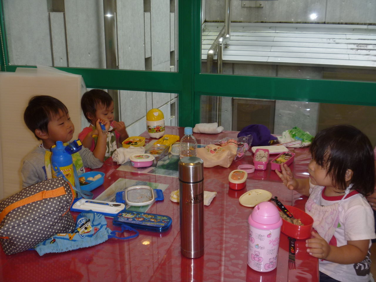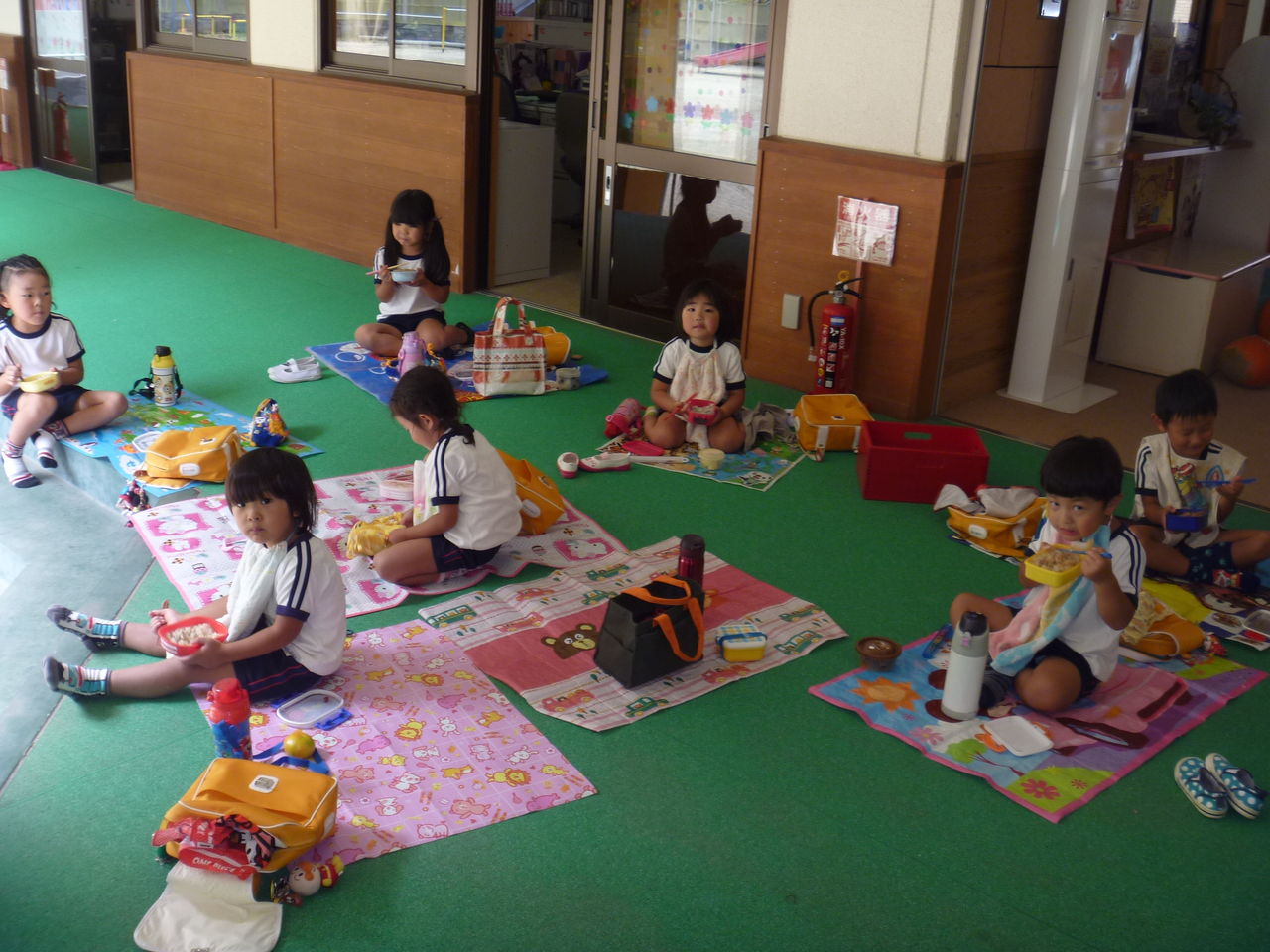 保育園に戻ってから今日は廊下にシートを敷いて、お弁当をたべました(^_^)ニコニコ