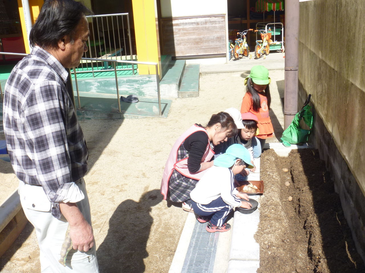 トマトのおじちゃんに教えてもらいながら、イモの切り口に灰をつけて、みんな上手に植えてくれました('▽'*)ニパッ♪