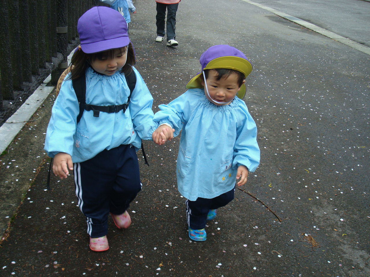 お散歩に慣れているお友だちが、リュックも持ってくれて、新入園児にも優しく手をつないでくれています