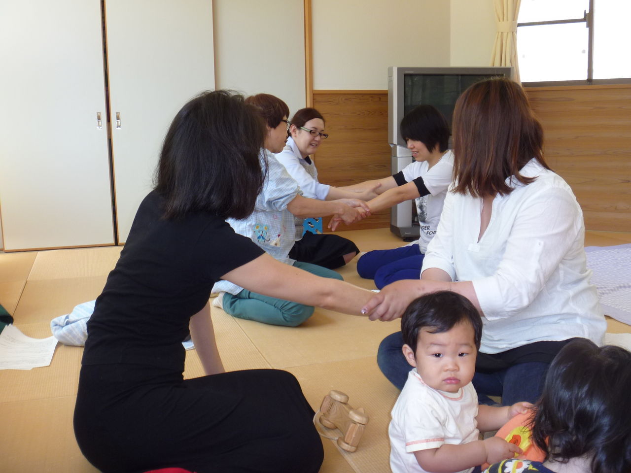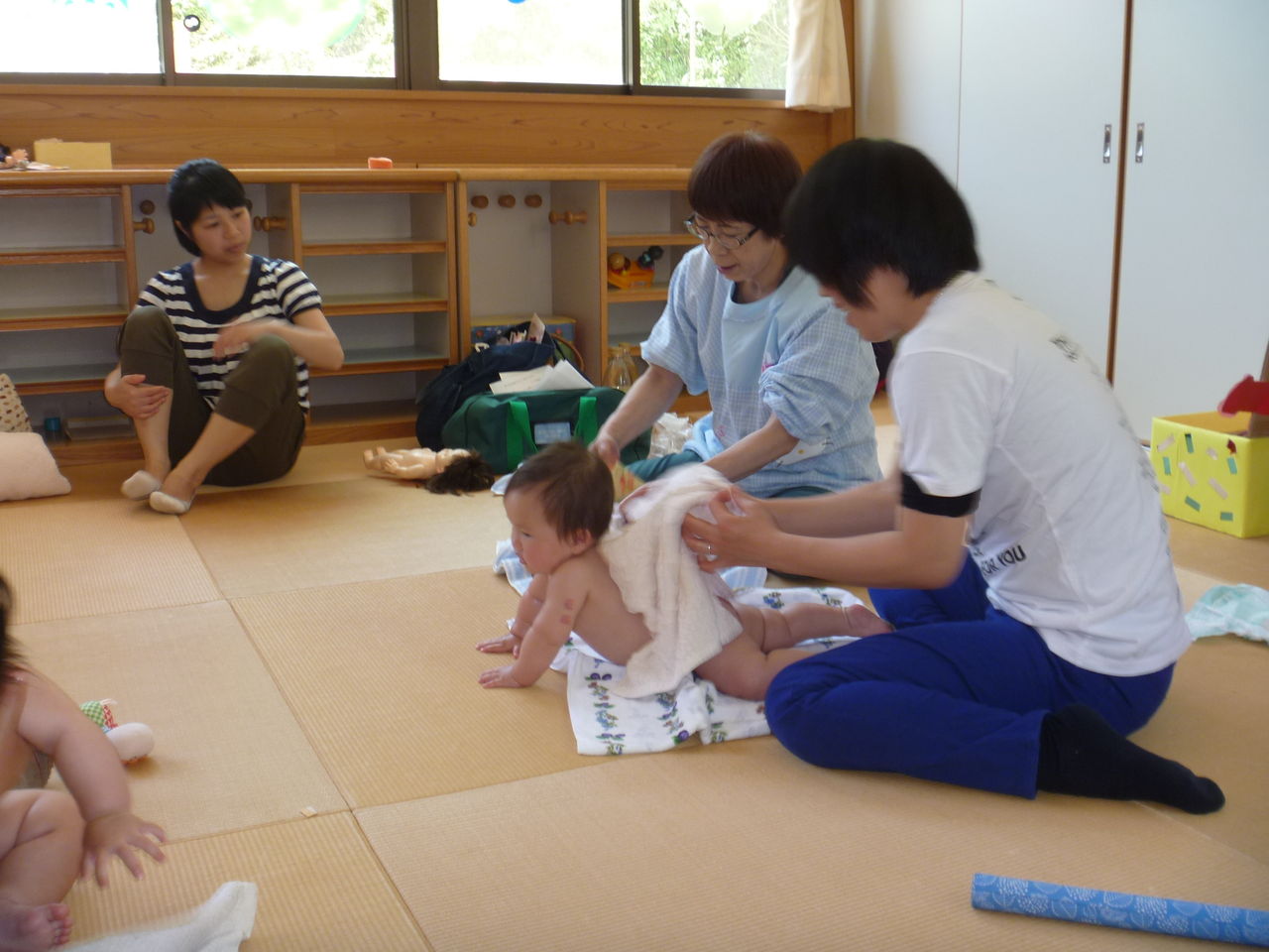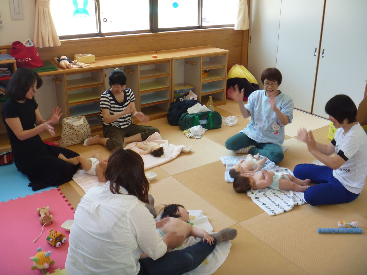 今回は、助産師さんにベビーマッサージを教えてもらいましたよ まずは・・・ママさん同士で、腕や手にオイルでマッサージ・・・