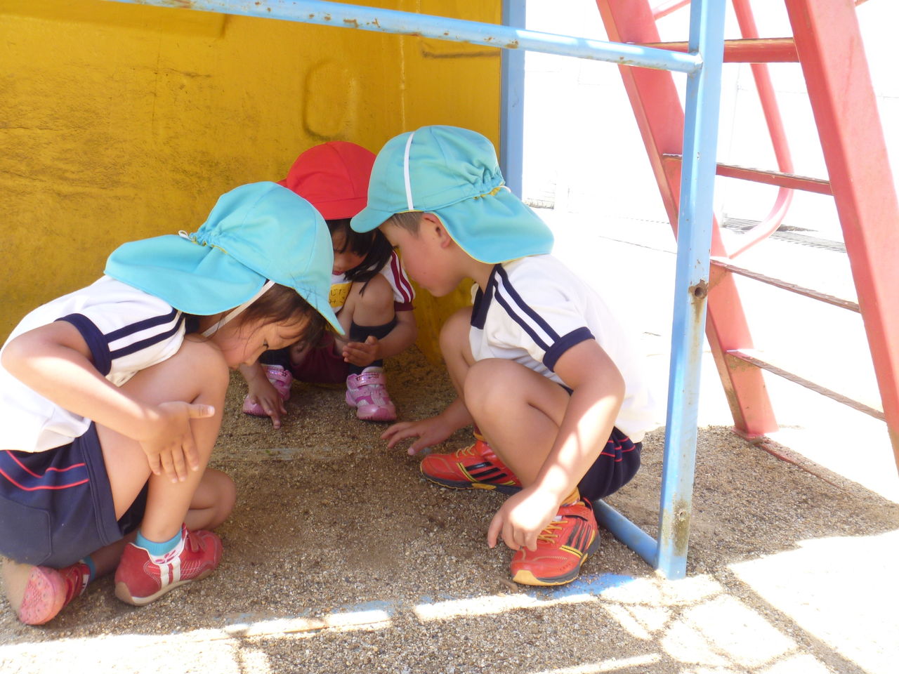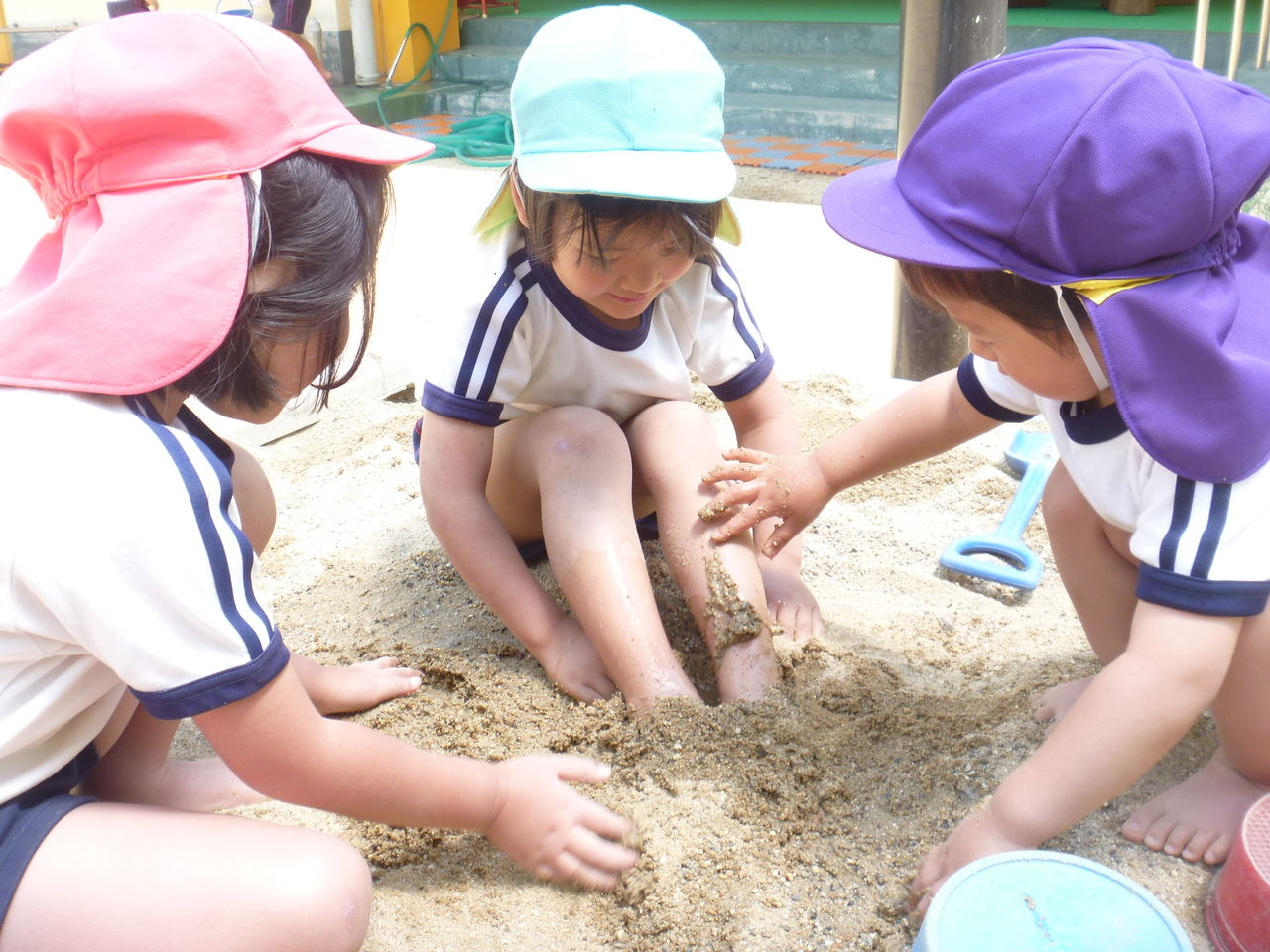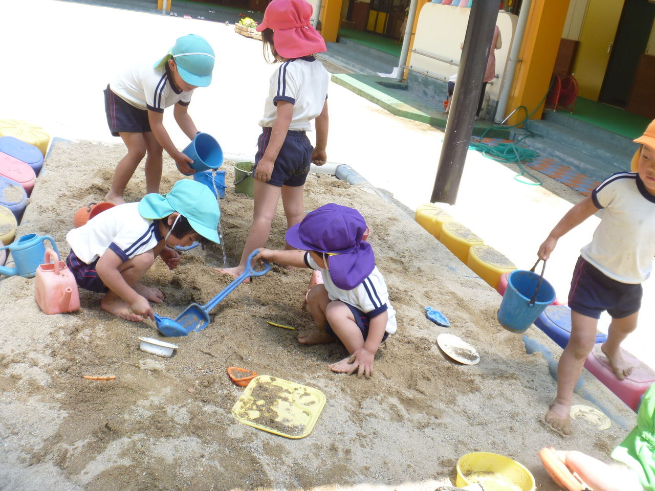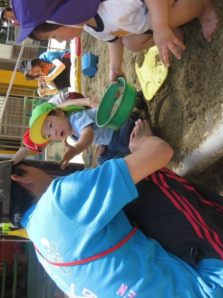 今日もとっても暑くて、みんな裸足になって、砂場遊びが始まりました〜