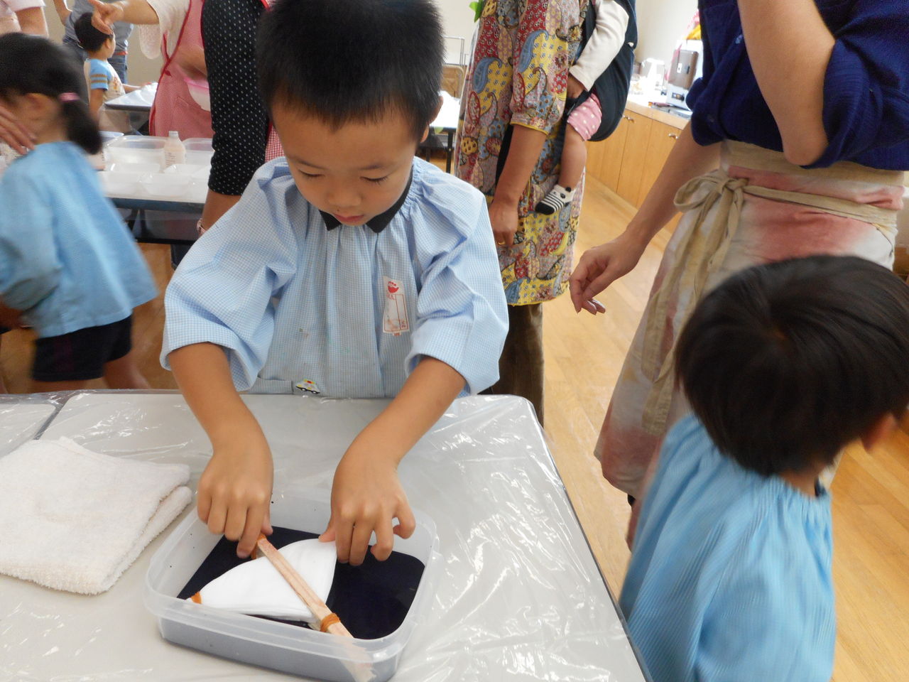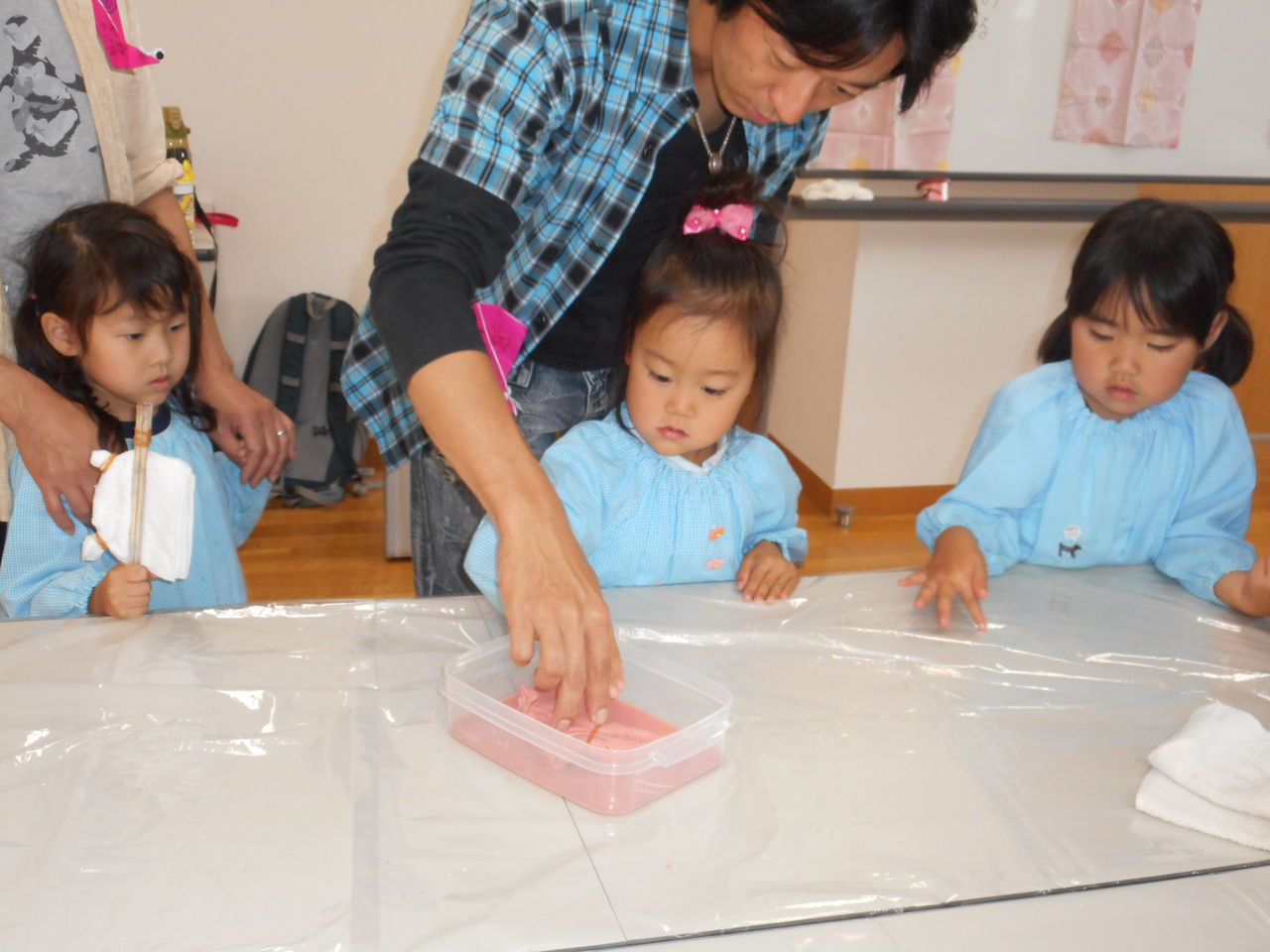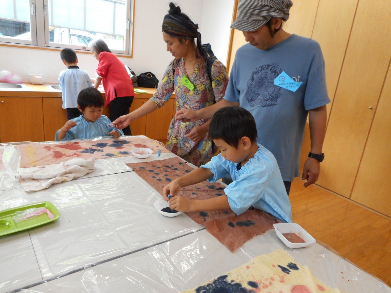 さてさて、ふれあい遊びの後は、お待ちかねのべんがら染めの体験です