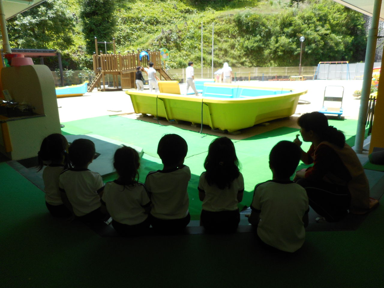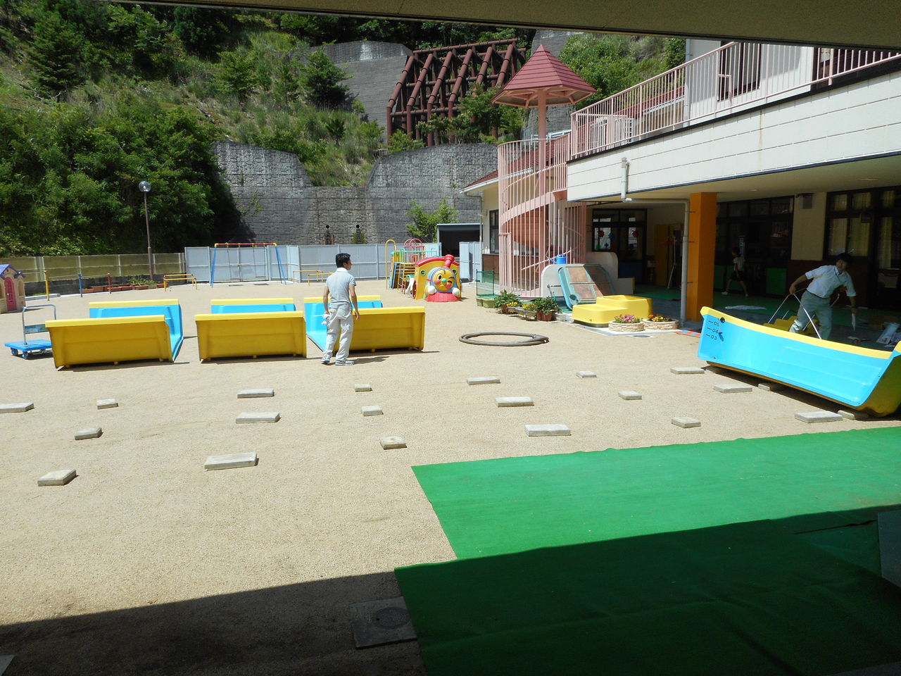 今日は朝から園長先生をはじめ、役場の方がプールの組立てに来て下さいました