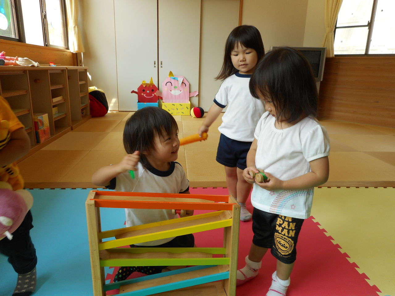 さてさて、今日は園庭で遊べなかったので、りす・ひよこ組は遊戯室で遊びました(^_^)ニコニコ