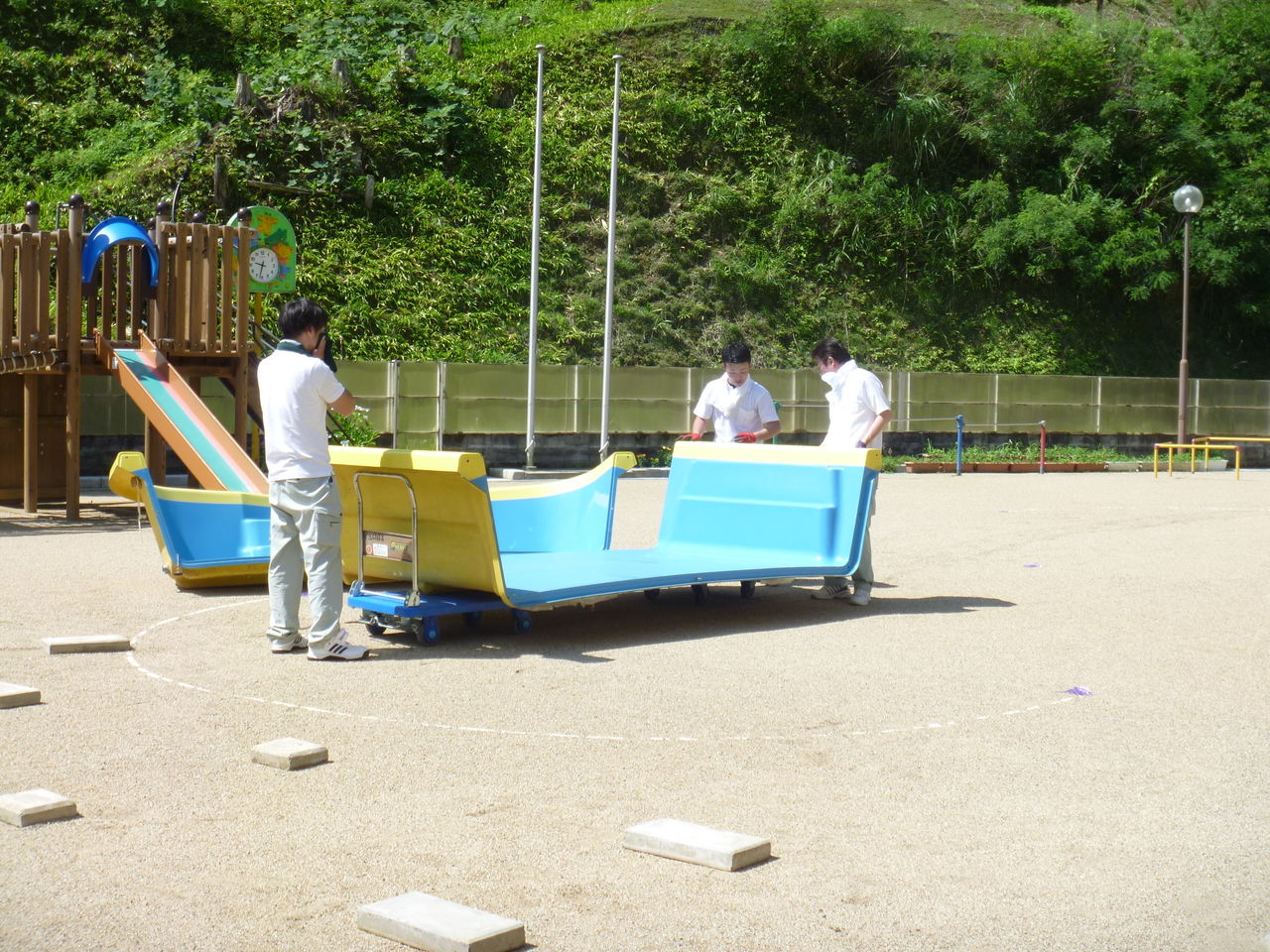 今日は、プールの設置に役場の人と園長先生が来てくれました(o^∇^o)ノ