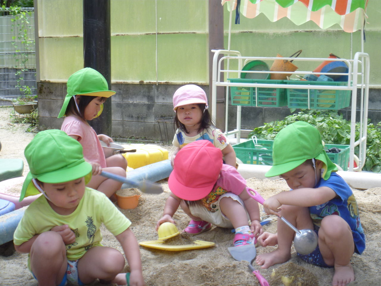 今日は、一時預かりのお友達も遊びに来てくれて、一緒にすな遊びを楽しみました〜