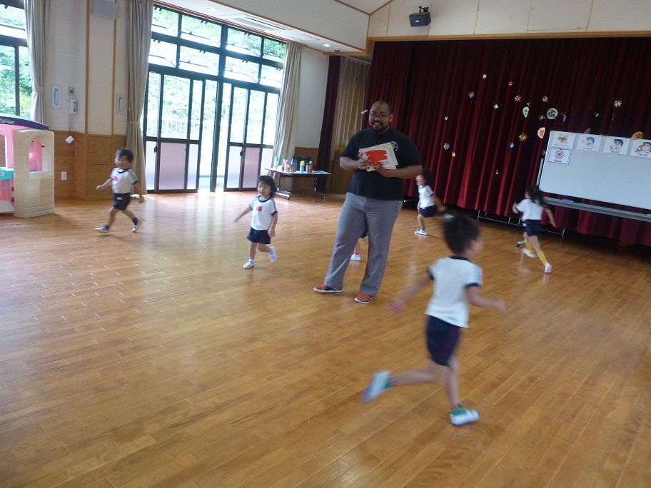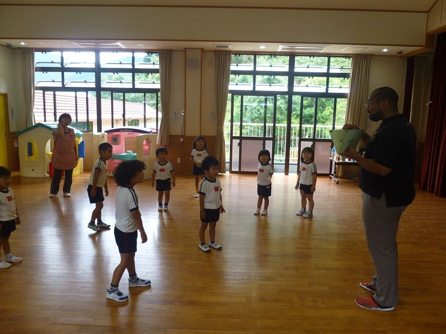 今日は、小・中学校に英語を教えに来てくれているALTのレニー先生が、保育園に来てくれました