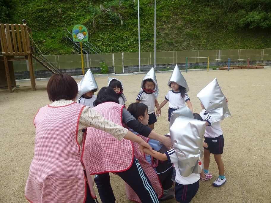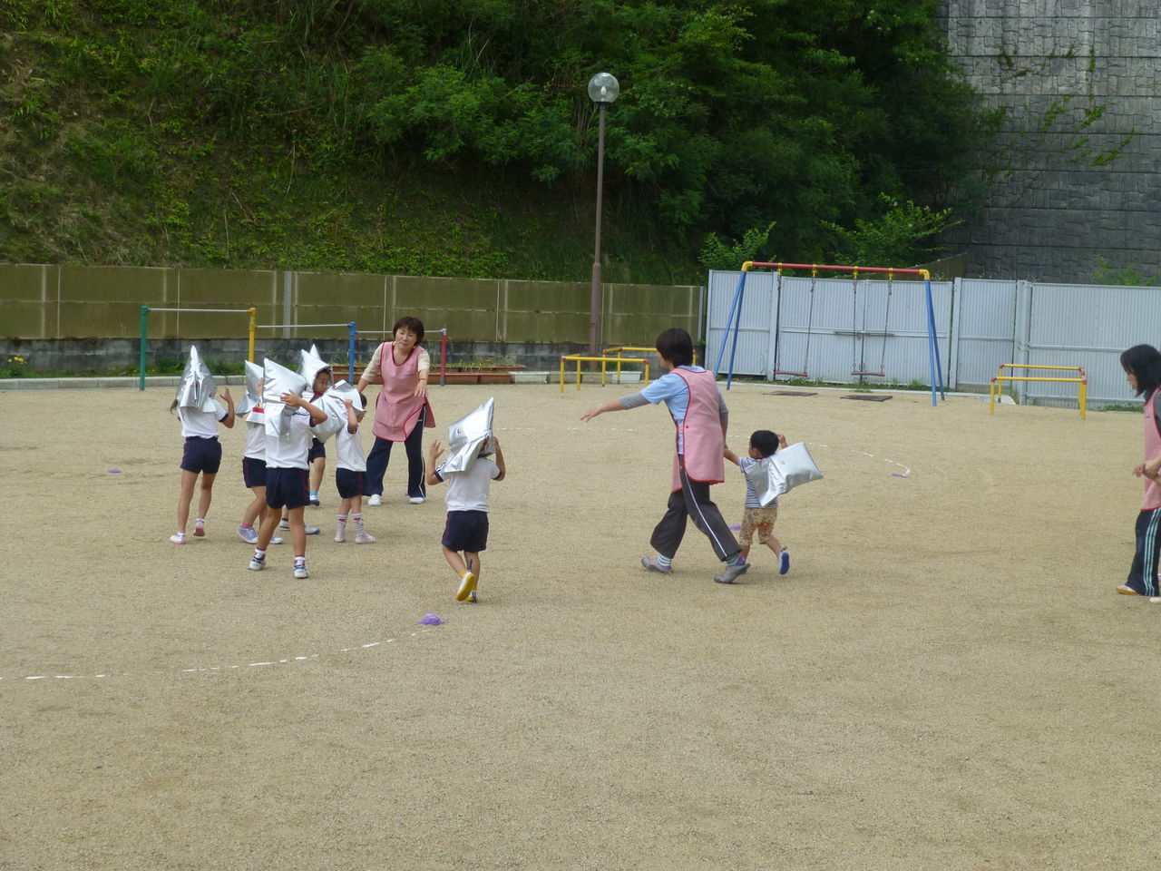 うさぎ・きりん・くま組さんは、防災ずきんもサッとかぶり避難することができました(* ́∇`*)