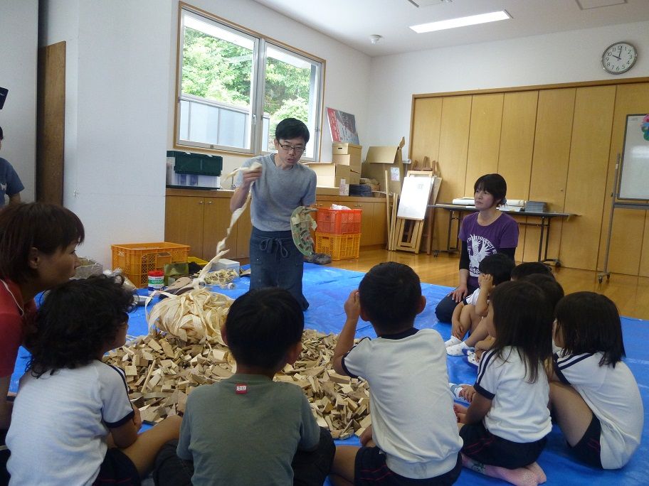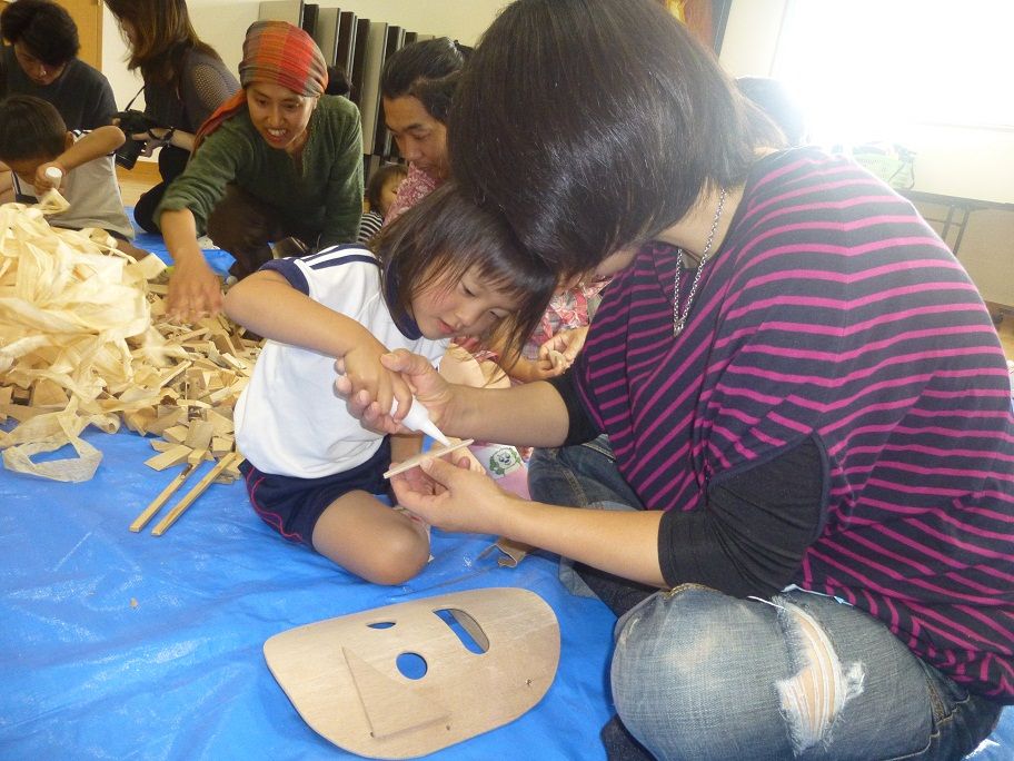後半は、匠のむらの芸術家 松本一平先生を講師にお招きし、木片やかんなくずなどなどを使ったお面づくりをしました〜