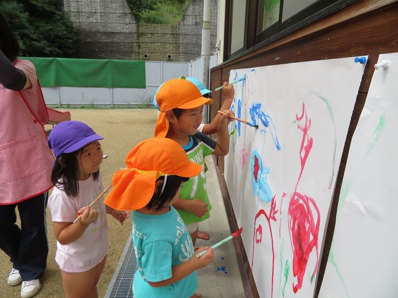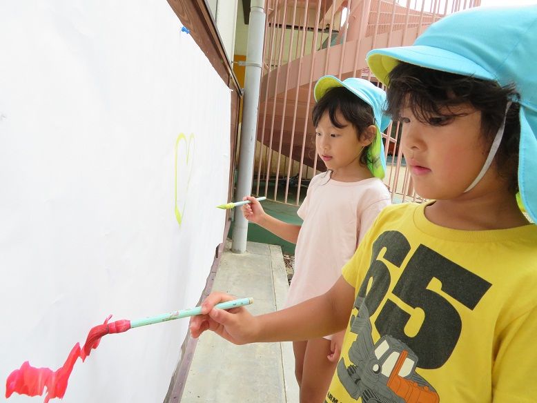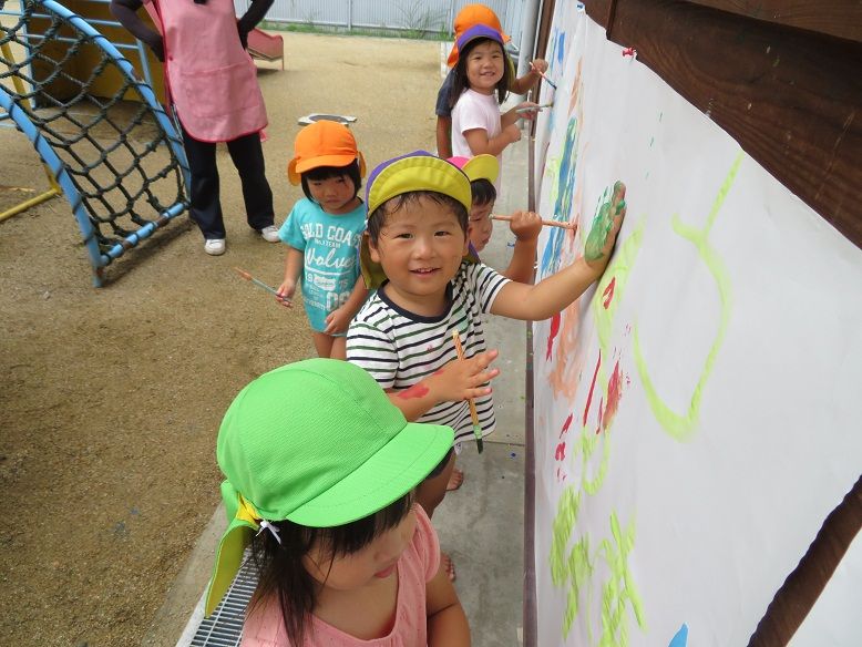 壁に貼ってある大きな紙に、子どもたちは喜んで描きはじめましたよ〜