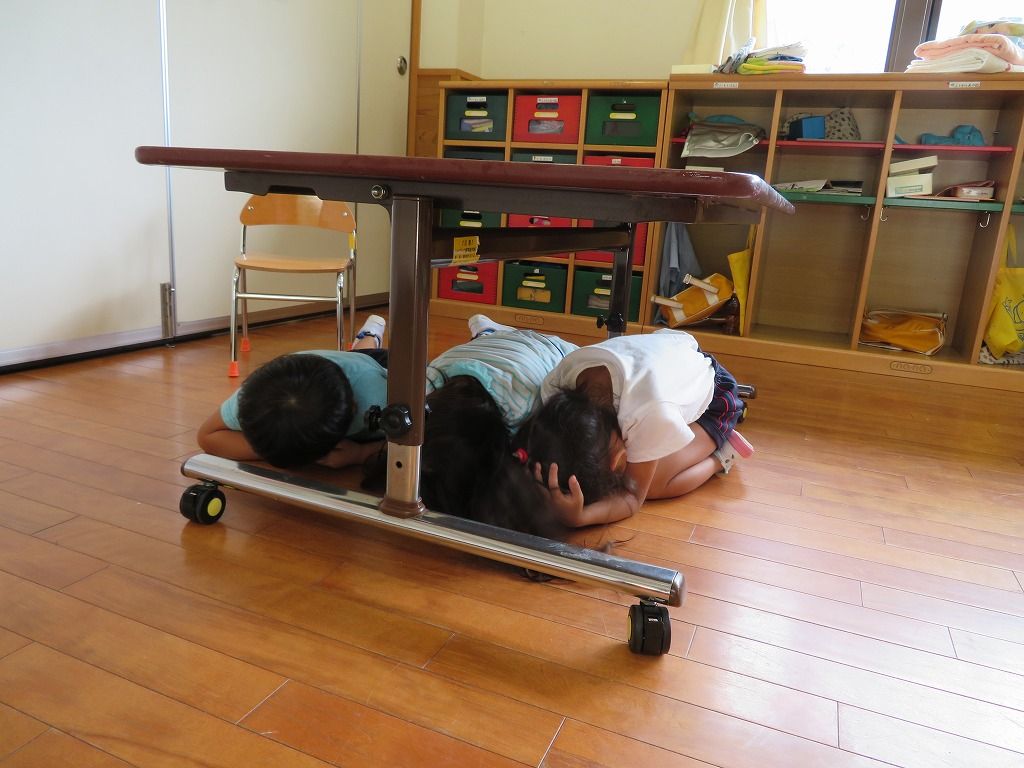 遊んでいるときに地震が発生し、ただちに机の下にみんな隠れて、身を守りました!