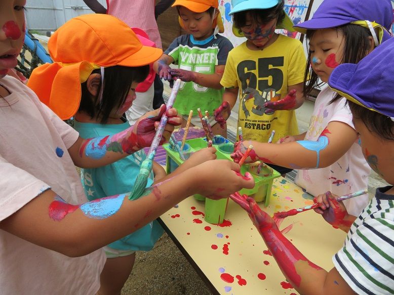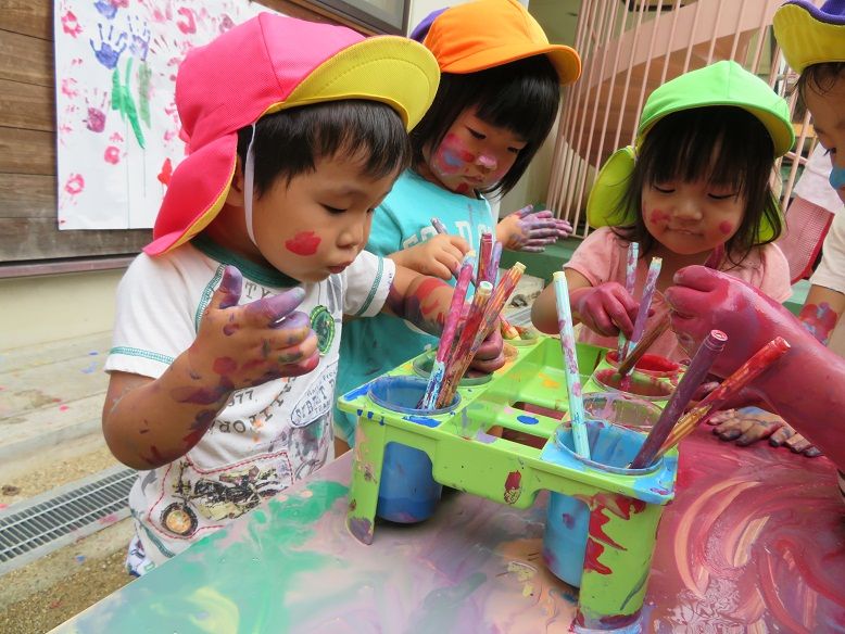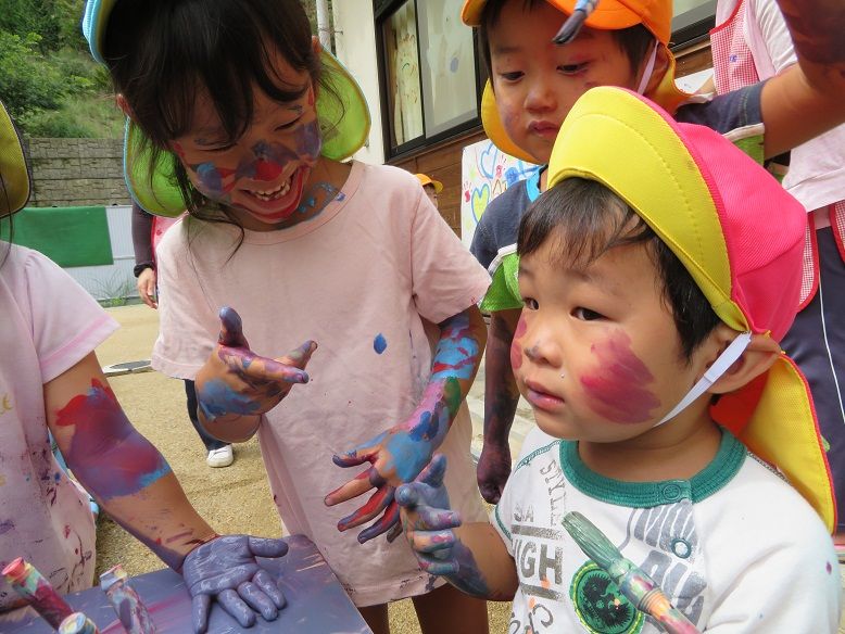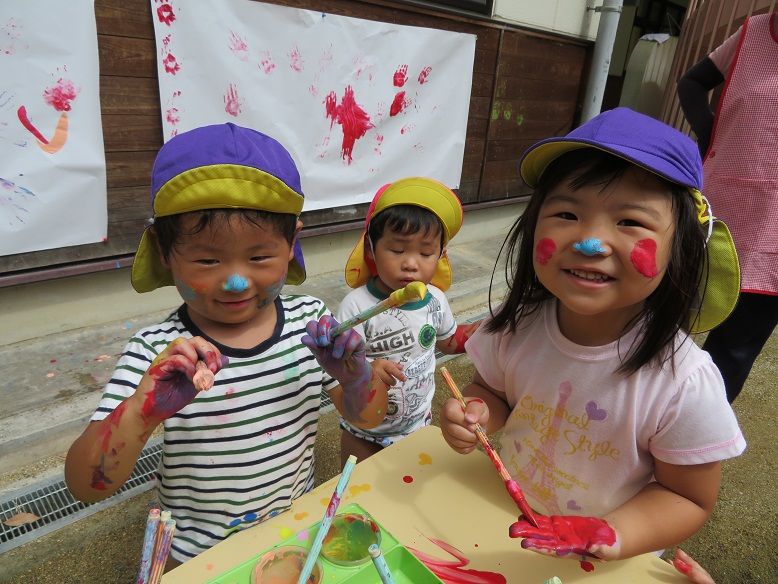 色が混ざるのを楽しんだり、全身で感触あそびを楽しんでいましたよ〜