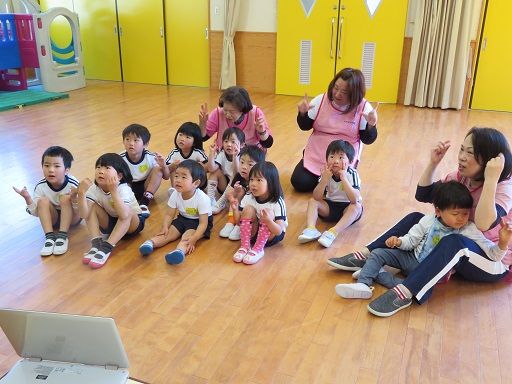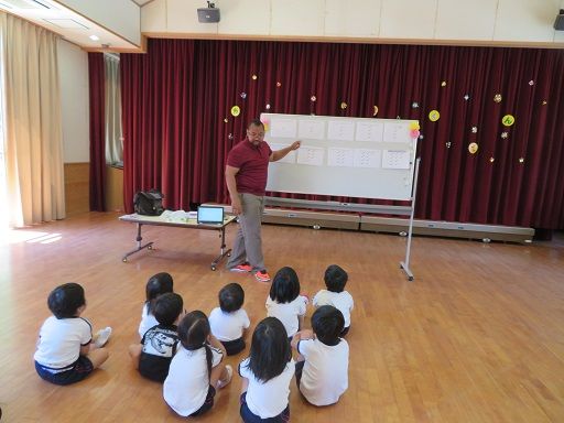 英語であいさつをしたり、英語の歌をうたったり、数をかぞえたりして遊びました