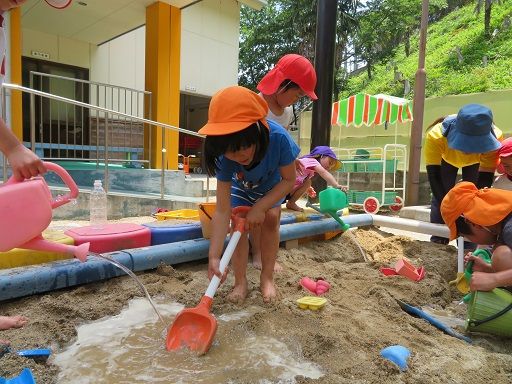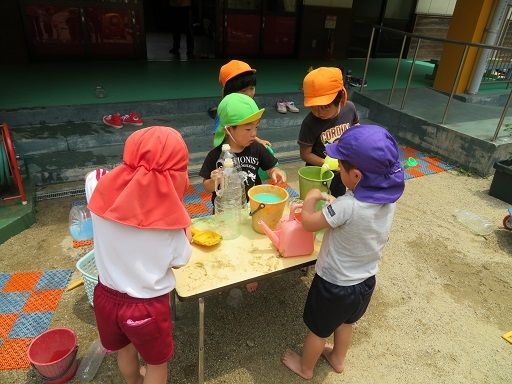 今日もとっても暑かったので、裸足になって、色水遊びや泥遊びをしましたよ〜