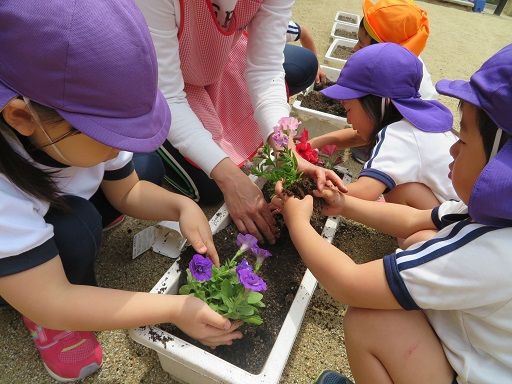 お花の名前を覚えたり、夏野菜をみんなで考えたりしてから植えました