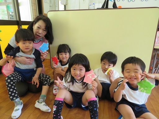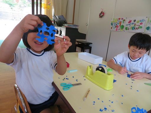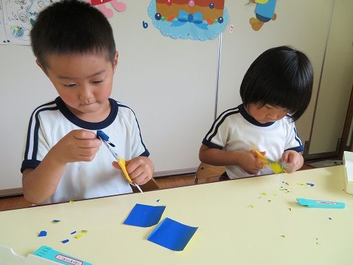 折り紙や画用紙をチョキチョキ切ったり、折ったりしながら
