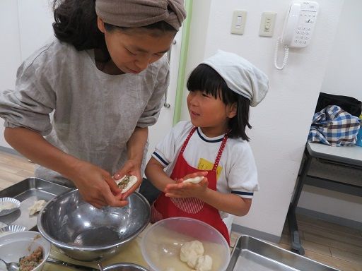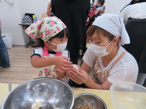 豚まんの生地を伸ばしてタネを包むことをしましたよ(o^∇^o)ノ