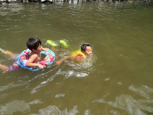 深いところもあって浮き輪でどんどん泳いでる子どもたち