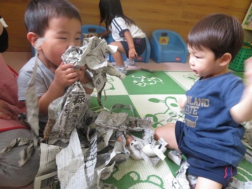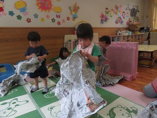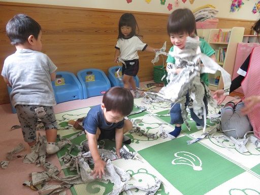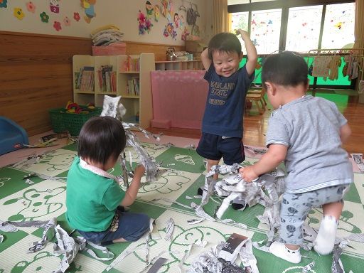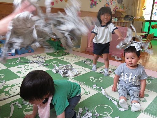 いっぱい破れると、頭からかぶったり、いっぱい集めてなげたり、お友だちや先生にかけたりして楽しみました