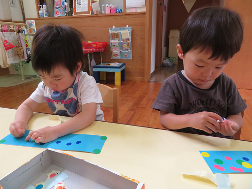 シールを貼ったり、お花紙を丸めたりして、両面テープをめくったり、細かい作業を真剣にしていましたよ♪