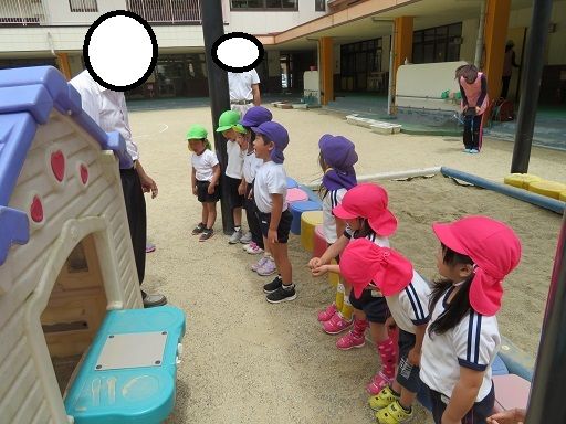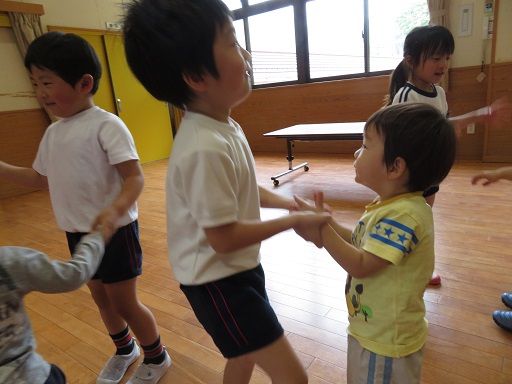 お弁当終わってから、くま・きりん組さんは一緒に戸外あそびや室内あそび。