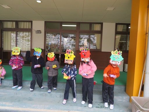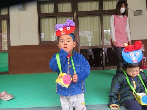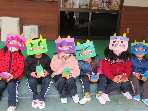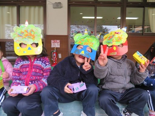 豆まき会が終わった後は、オニのお面を被って豆まきをしました。(o^∇^o)ノ