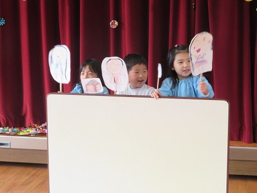 そのあとは、お楽しみでくま組がこっそり練習していた、手あそびと手作りペープサートを披露しました。(☆゚∀゚)