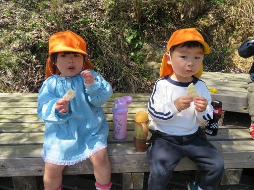 道中みんなでおやつを食べて、春の自然物を散策しました