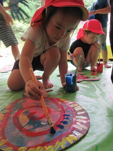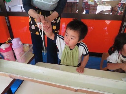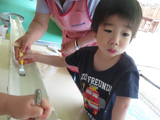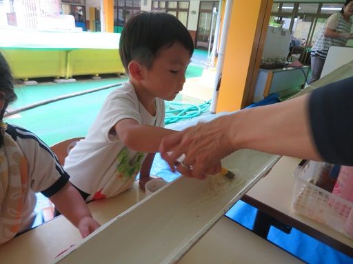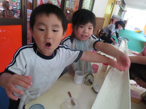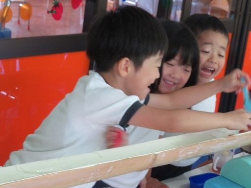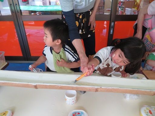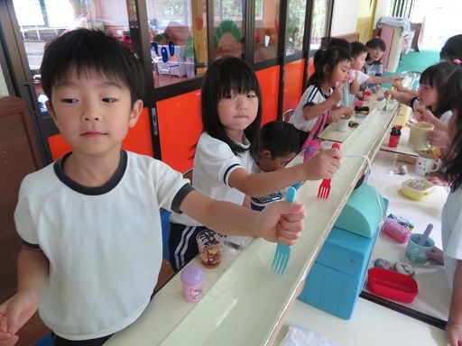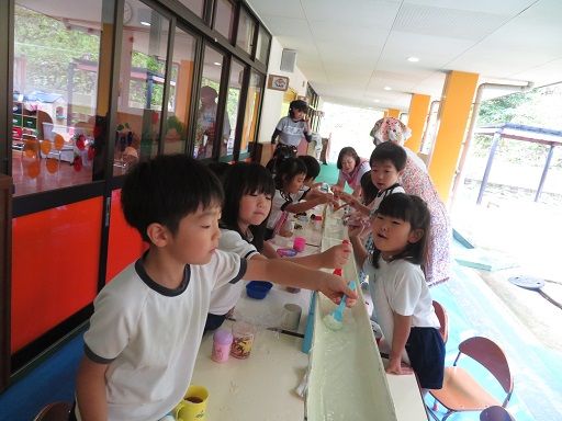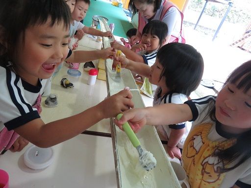途中でお友だちと色を混ぜて、「あっ色が変わった〜」と、色の混ざりを楽しんだり