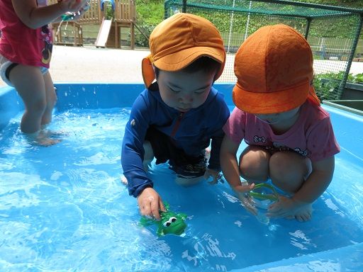 ワニやカエルになりきって泳いだり、バタ足の練習をしたり