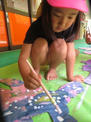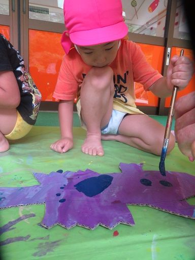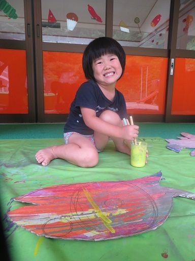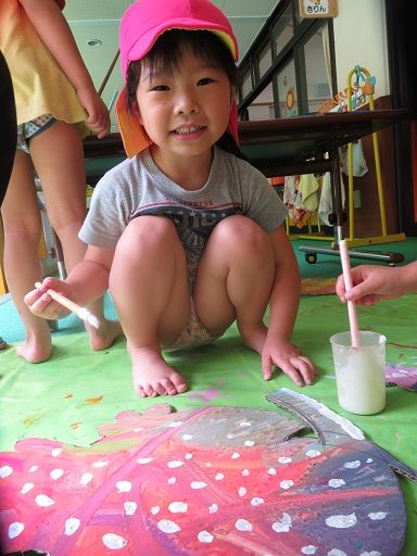 存分に筆でのお絵かきを楽しんだ後は、大きな紙にペタペタと手形や足形を押して楽しんだり、体中に塗ったり〜v( ̄∇ ̄)v