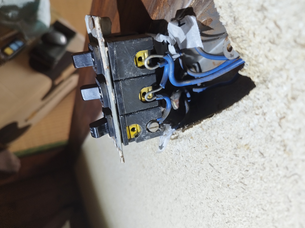 三路スイッチの端子の位置も違います。上の写真で渡り線が付いている場所が0番で、その隣と反対側に1番と3番があります。このスイッチの近くに階段の電球があるのに、片切りスイッチと渡り線で繋がっているのもヘンです。どう繋がっているのか、小一時間考えて結論がでましたが、説明が面倒くさいのでやめておきます。