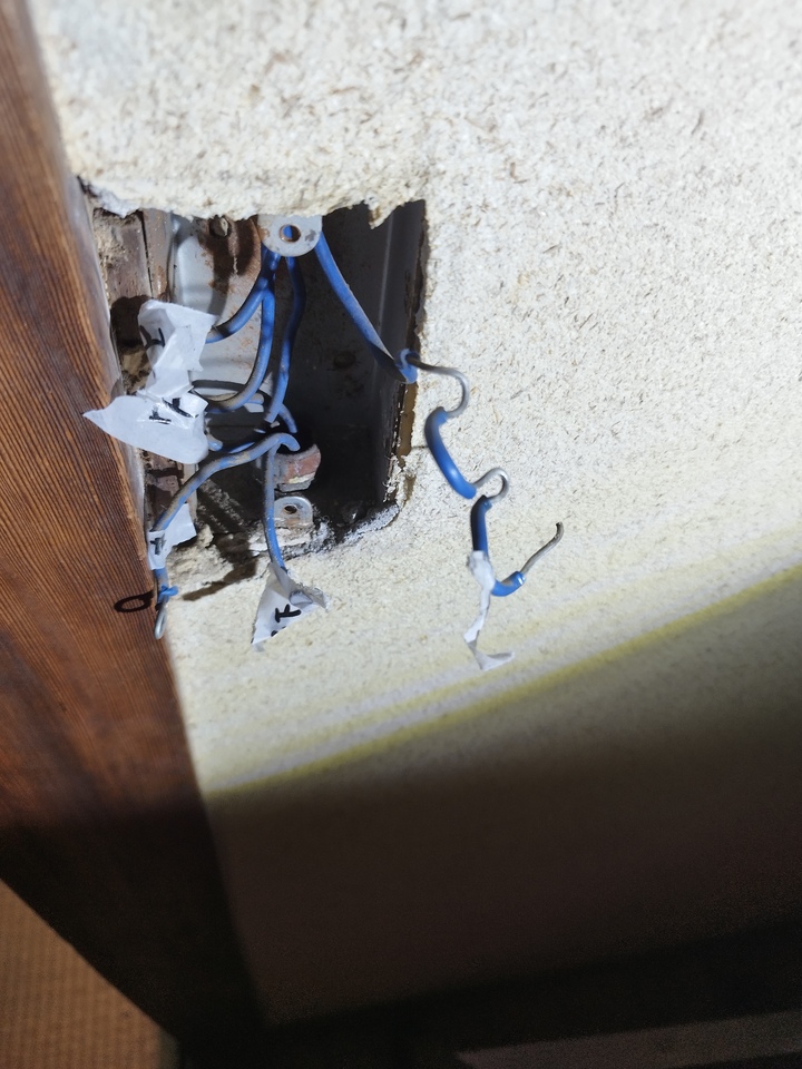 まさか全部青い電線に繋がっているとは思いませんでした。これでは迂闊に外すと、どれがどれだか分からなくなります。現代の電工さんはマジックで「階段上」とか「リビング」とか書くのですが、こんな線では書けません。昔の電工さんはどうやったのでしょうか。