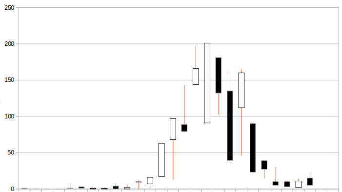 このチャートで底を打っているように見える陰線のあたりが、感染者数が10人以下になったころ(18日〜22日)である。このころ、僕はこのまま一桁台が続いて5月の終わりには0が出てくるだろうと予想していた。ところが、最近10を越す日が増えてきて、チャート的には反発したように見える。