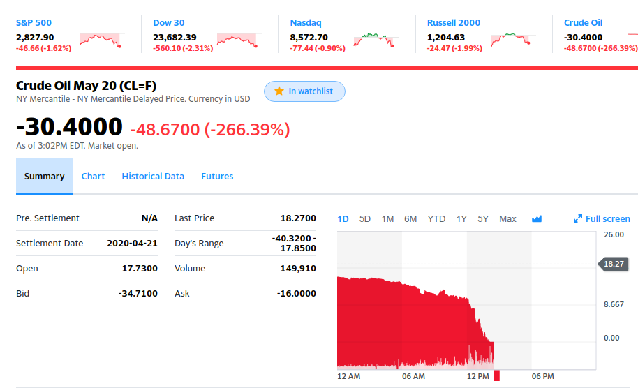 何が起こったのかというと、世界の原油価格の指標となるWTI原油先物価格がマイナス30ドルになったのである。ようするに「原油なんかタダでもいらん、受け取るなら売る方が1バレル当たり30ドル払え」ということだ。簡単に言えば、コロナで世界中が引きこもりになり、タンクが一杯になってしまったのである。