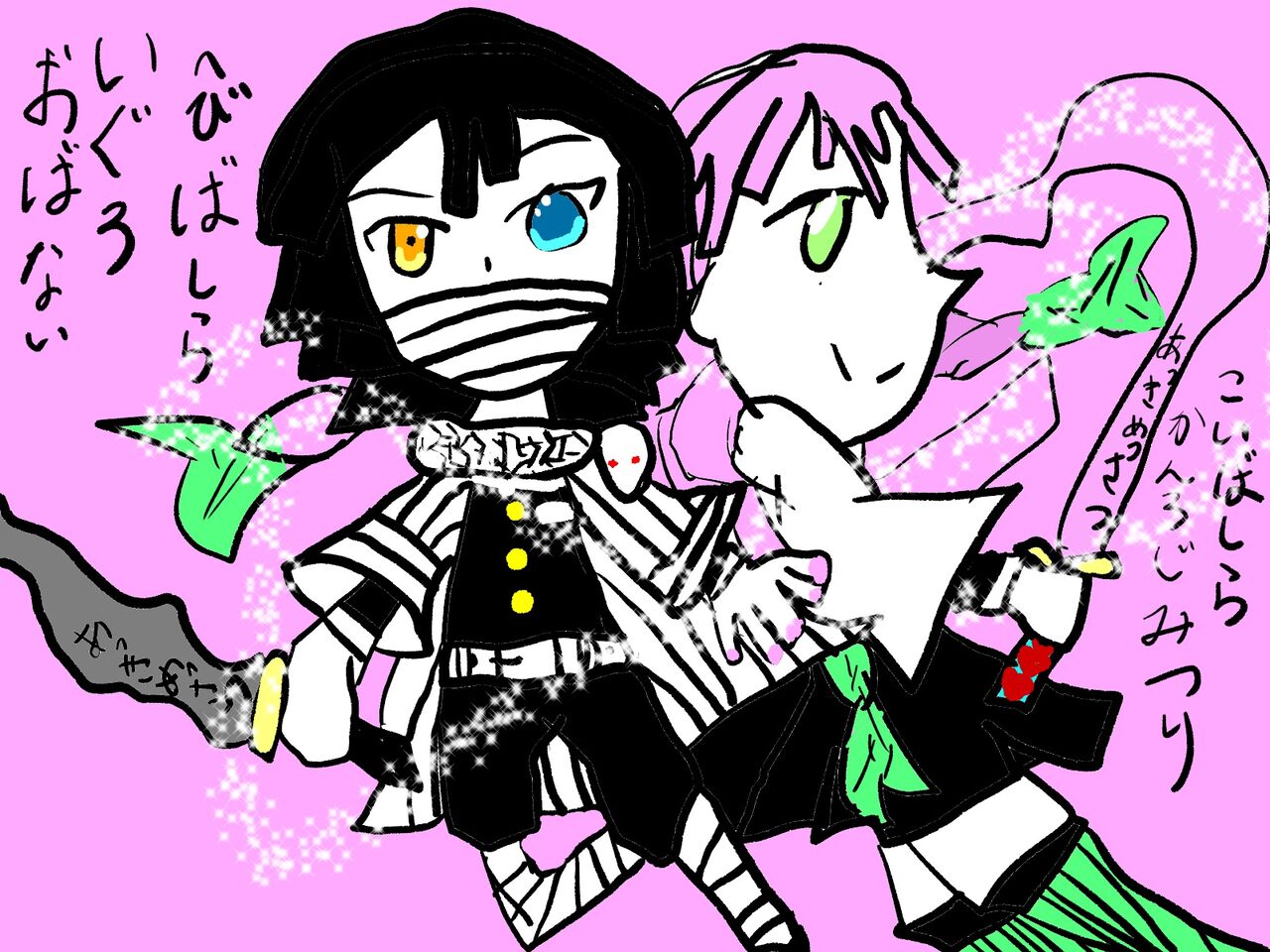 (家族が画いた「鬼滅の刃」の登場人物。「伊黒さん」は、同じ文学部のとある先生の「推し」です。ちなみに私は「善逸」。家族は「伊之助」推し)