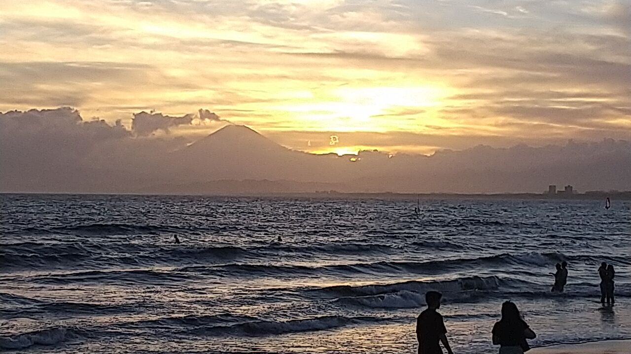 花火の前に見た、海と富士山と夕陽。この時期に見えるのは珍しいようで、思わず合掌。